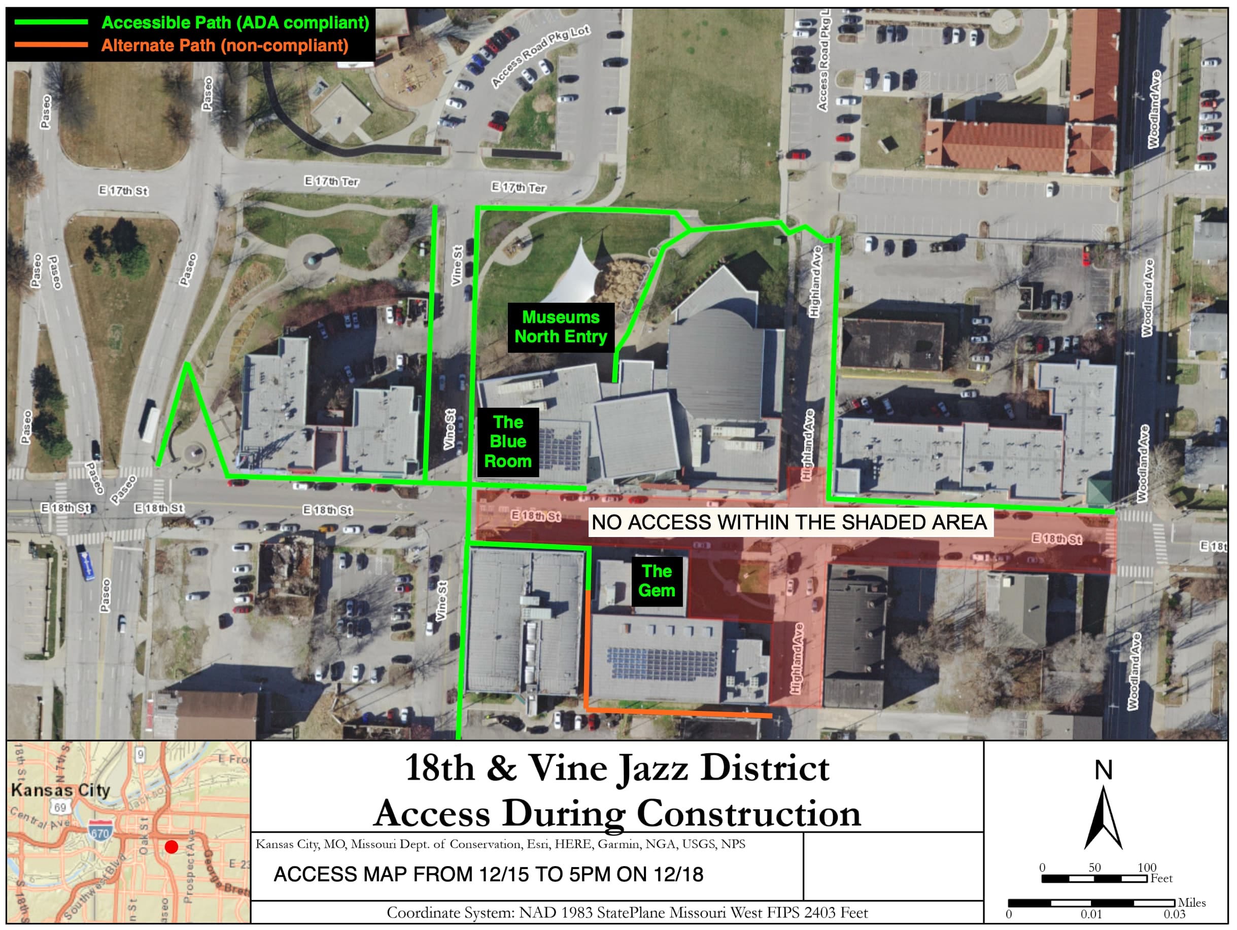 Please note that temporary pedestrian access changes will be in effect at the American Jazz Museum and the Gem Theater due to nearby road construction.